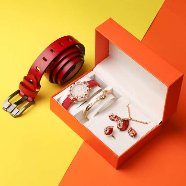 El conjunto de joyas de 6 piezas, un reloj y un cinturón.